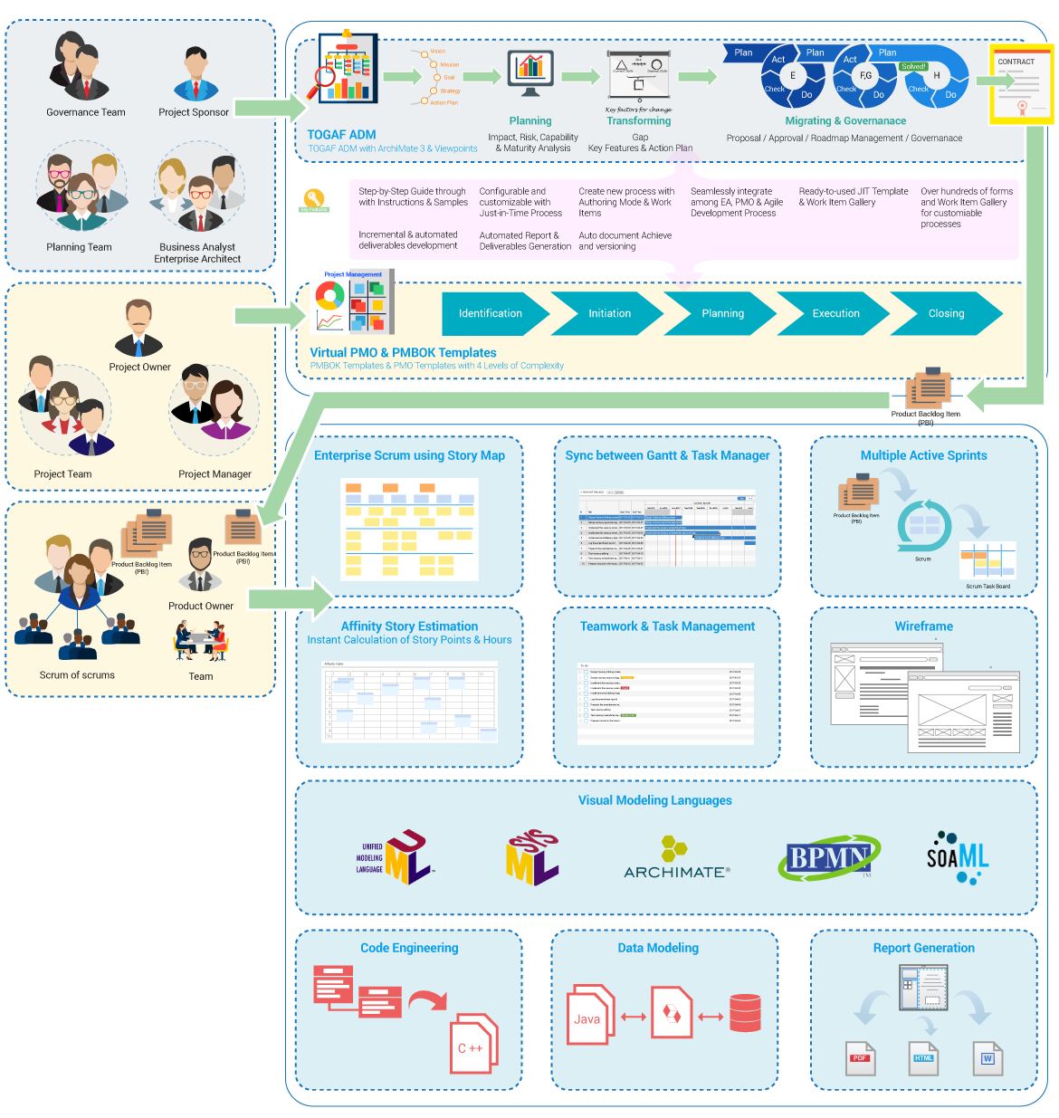 Visual Paradigm is a world-wide leading award-winning enterprise management and software development suite, which provides all the features you needs for enterprise architecture, project management, software development and team collaboration in a one-stop-shop solution.