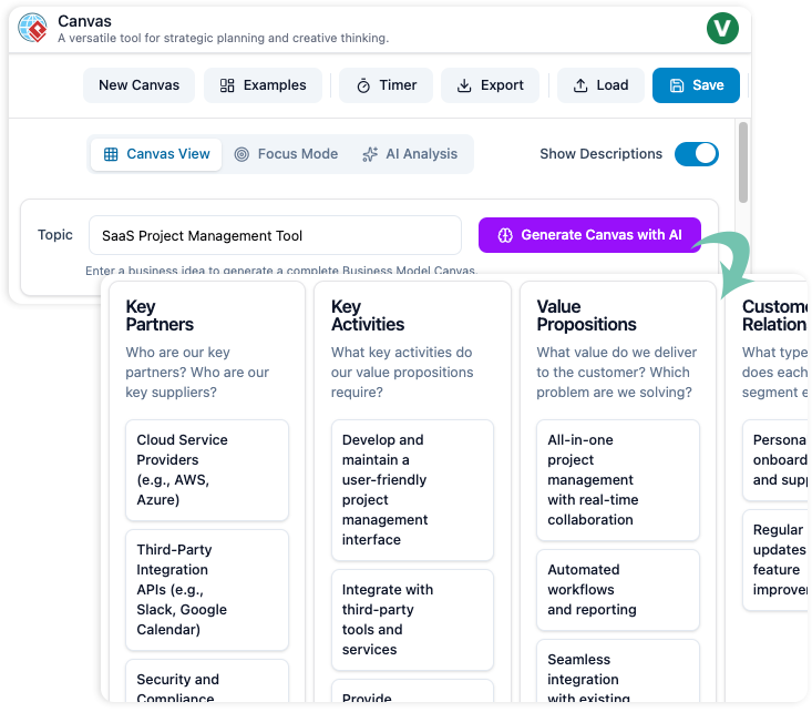 Have a business idea, a new feature, or a complex problem? Just type it in. Our powerful AI assistant will instantly generate a comprehensive, detailed canvas for you in seconds. Go from a spark of an idea to a full-fledged strategic map and kickstart your brainstorming process.