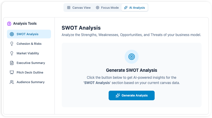 A canvas is more than a document-it's a tool for discovery. With a single click, our suite of AI analysis tools transforms your canvas into strategic intelligence. Understand your model's strengths, uncover hidden risks, and prepare for your next big presentation.