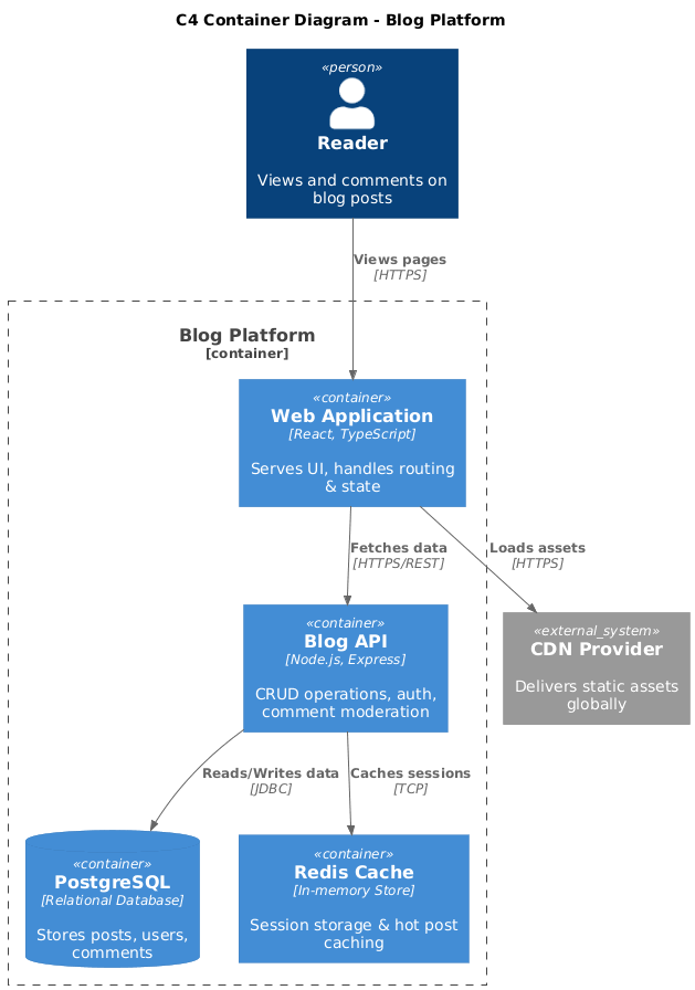Container(api, "Blog API", "Node.js, Express", "CRUD operations, auth, comment moderation")