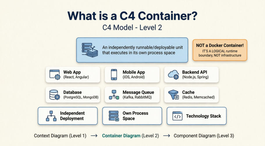 Container (C4): An independently runnable/deployable unit (app, DB, queue). Not synonymous with Docker.