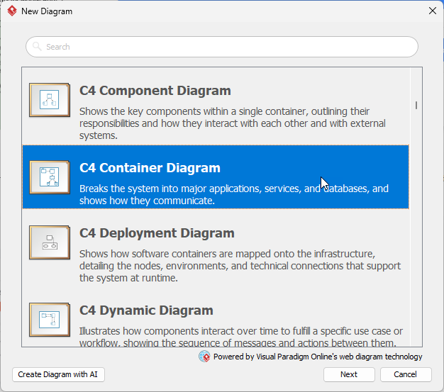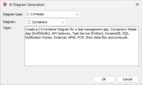 Open AI Diagram Generator (Tools > AI Diagram Generator). Select C4 Model to be the diagram type, Containers to be the diagram.